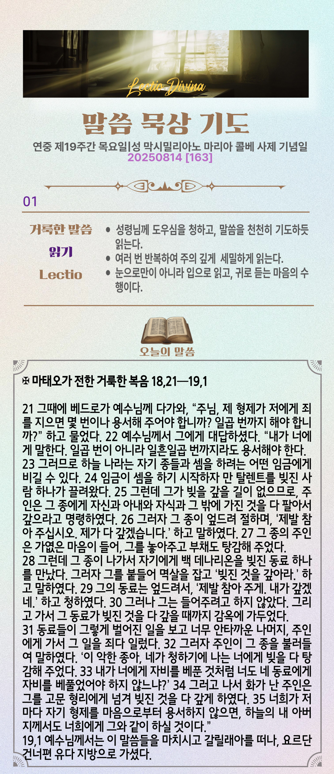 말씀묵상기도 LECTIO DIVINA [163] 20250814 연중 제19주간 목요일 | 성 막시밀리아노 콜베 사제 기념일