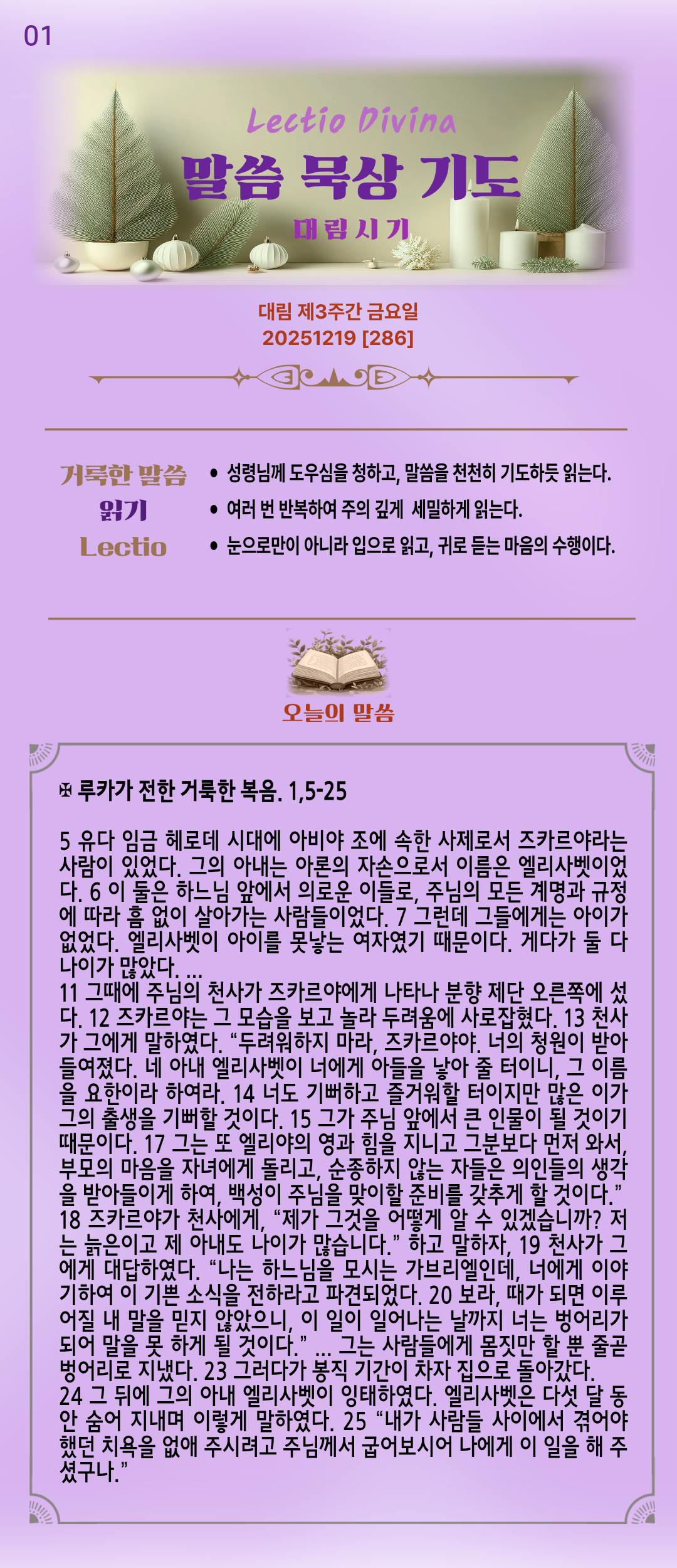 말씀묵상기도 LECTIO DIVINA [286] 20251219 대림 제3주간 금요일